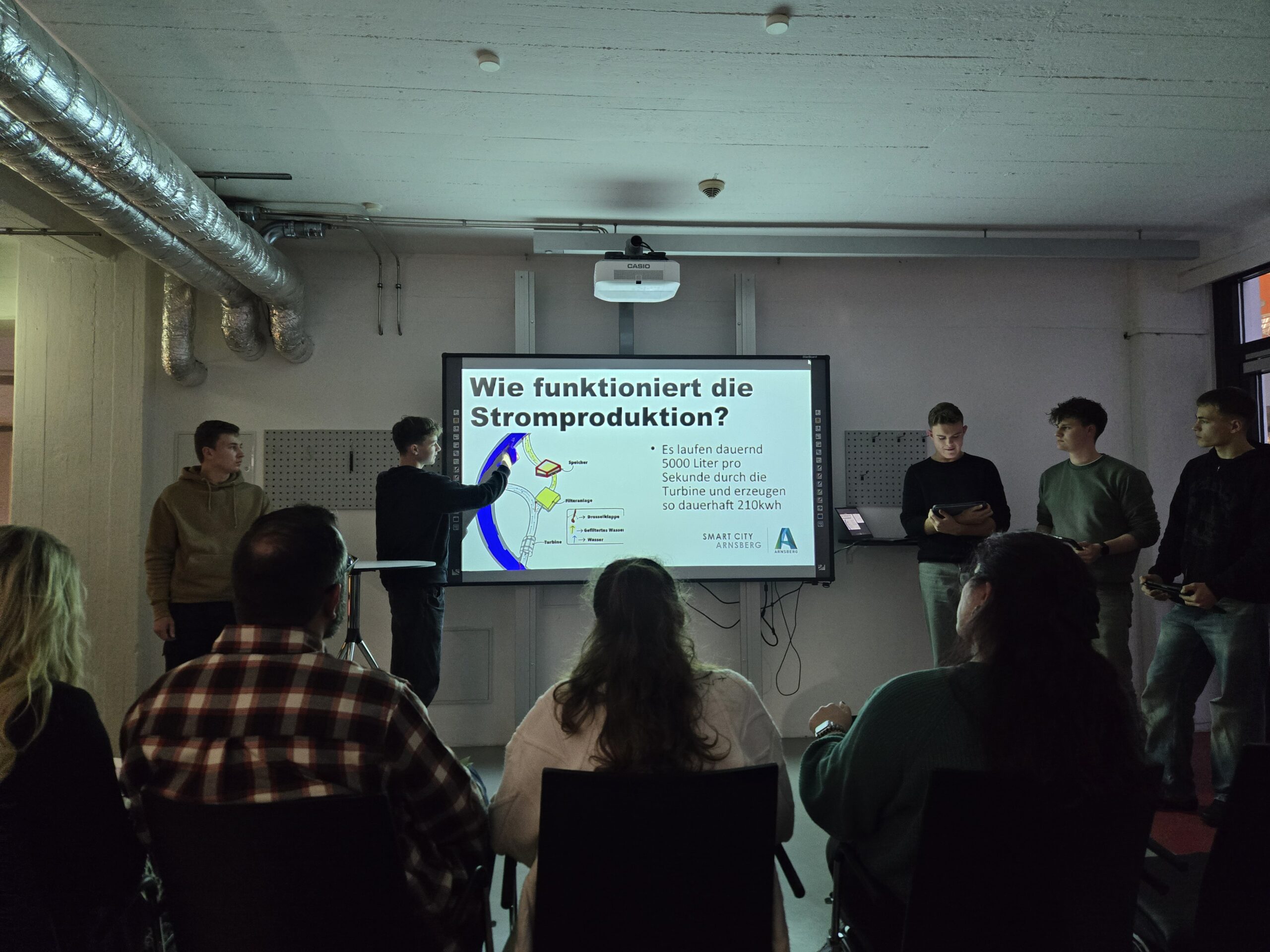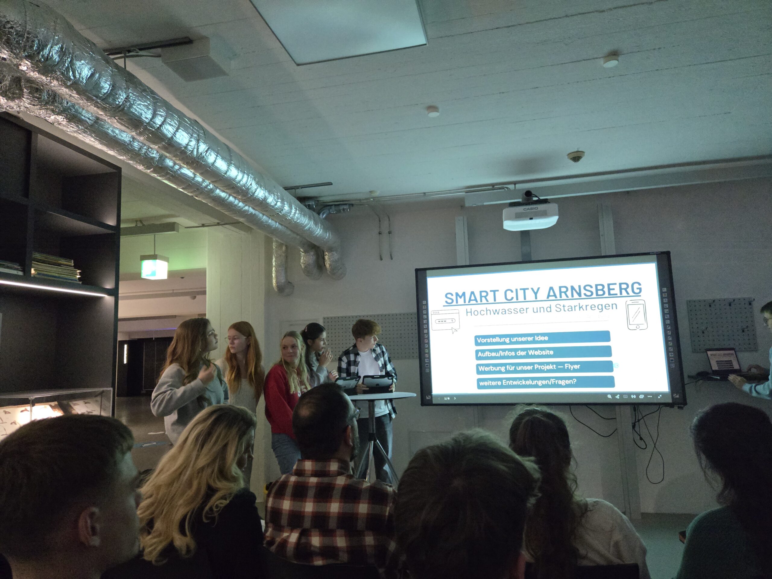 Auf Einladung der Stadt Arnsberg (Smart City-Offensive, Referat N) starteten 16 Schülerinnen und Schüler des Kurses Umweltforschung (Kl. 10) Ende November zu einem zweitägigen Make-A-Thon im F.LUX. Rund um das Thema Hochwasser und Starkregen entwickelt die Schülerinnen und Schüler Ideen und Konzepte zum Umgang mit der Thematik. So erstellte eine Gruppe eine Info-Website mit Hochwasser-Chatbot, eine andere Gruppe entwickelte ein technisches Modell zur Hochwasserreduktion, eine weitere ein Gesellschaftsspiel für Kinder.